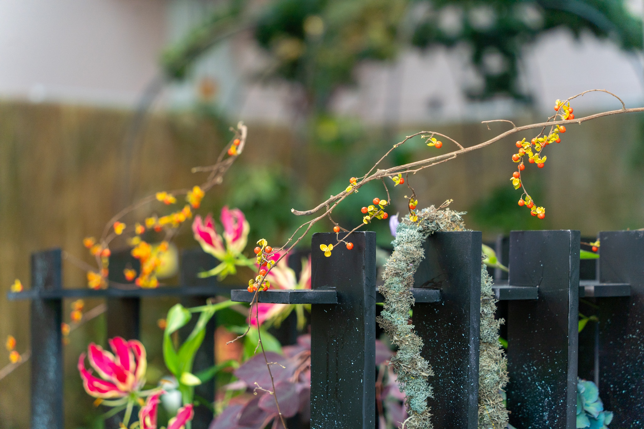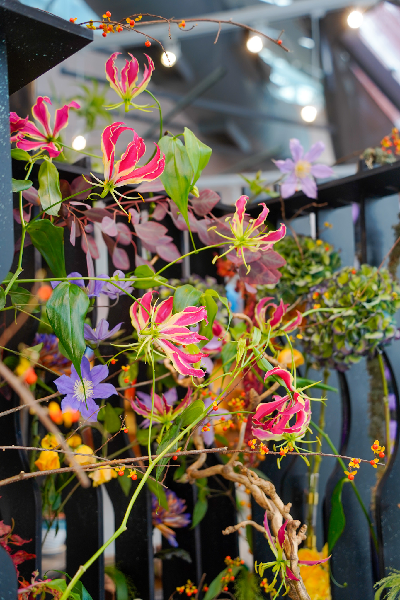 以「自然肌理與流線詩意共生」為理念,萃取巴塞羅那風格有機形態與 手工精髓,以曲線架構為基,借層疊穿插法讓花材於隙間舒展;憑材質對比、空間留白造呼吸感,引觀者入秋日花境靈動秘境,盡顯藝術張力。