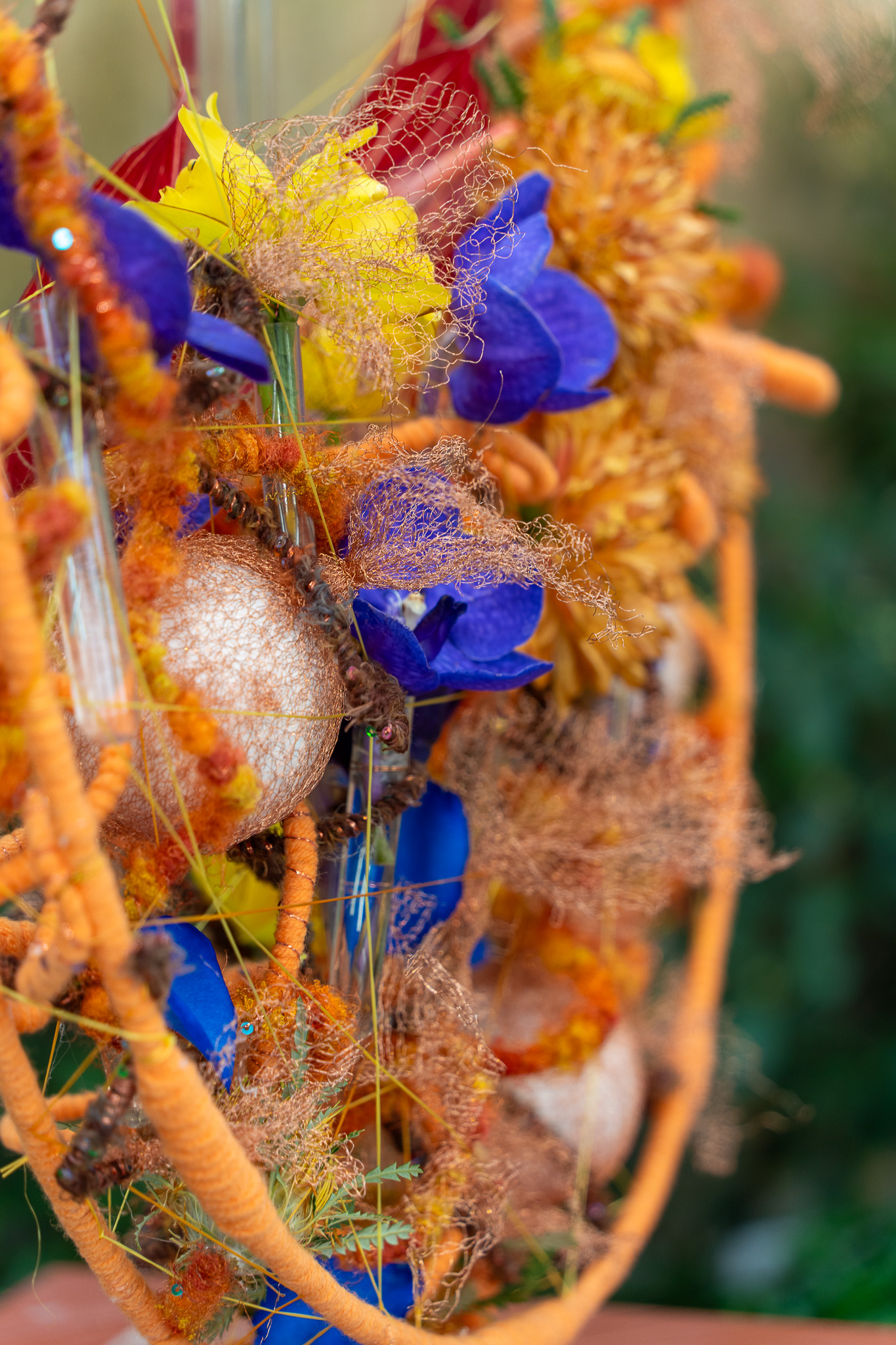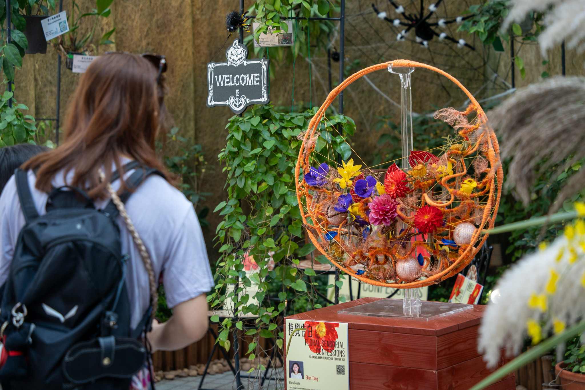 This project combined blooming flowers with artistic creativity to form an interesting floral display or use in catwalk purpose. Joyful to celebrate the natural beauties with flowers lovers. Hereby, I arranged a wire structure ring, fresh flowers, yarns, foam balls and mesh are applied to form the rhythms.