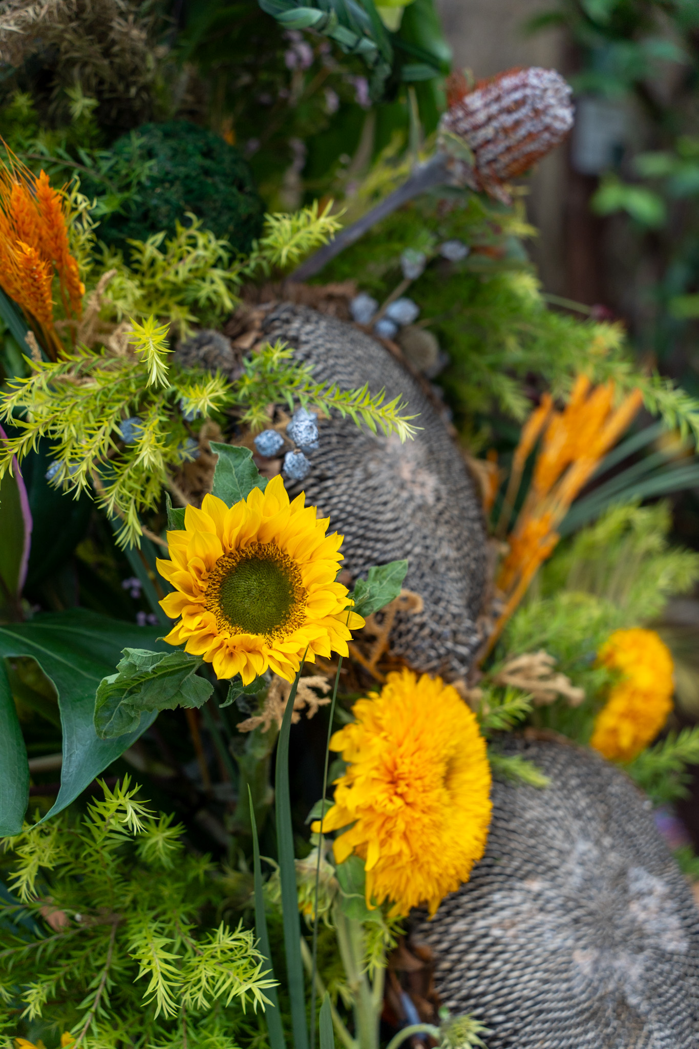 茂盛的樹木及漂亮的花卉,往往可以帶給大家正能量。她們有着不同的 形態、香氣及花語,更可以代表大家表達情感。 這個設計用了向日葵及向日葵花盤為主花,其他花材包括彎竹、鐵葉、蝴蝶蘭、尤加利果及酸醬果...等,以捆綁及編織的技巧製作。