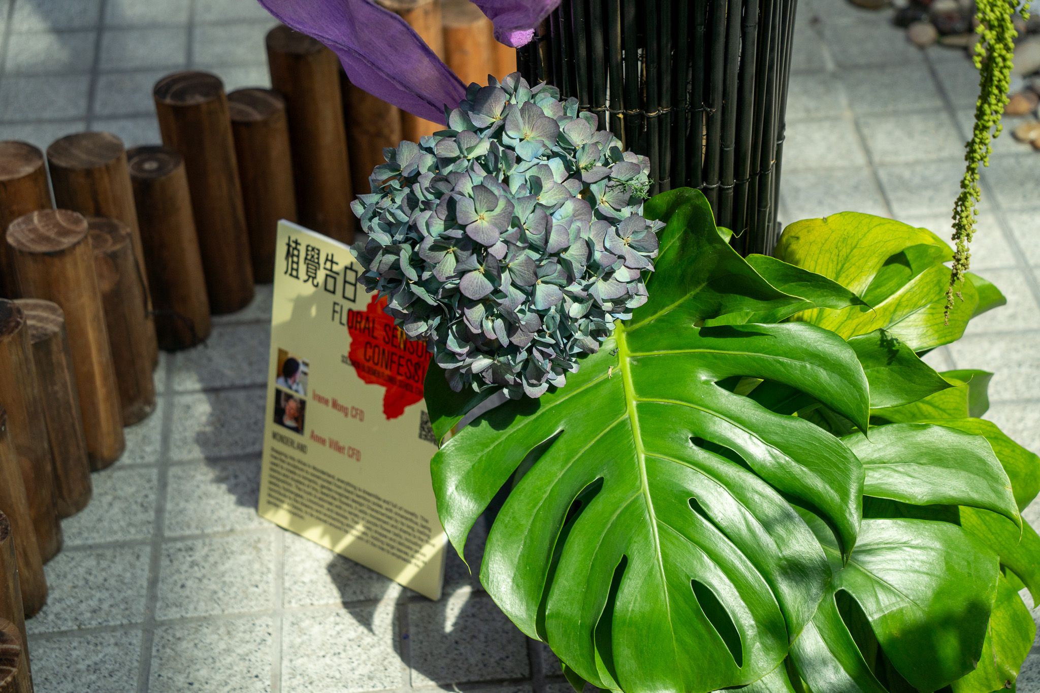 Stepping into Alice in Wonderland, everything is dreamlike and full of novelty. This tree-like sculpture is constructed from black bamboo poles, with Amaranthus, being used to create a romantic, garden-inspired design! Characterized by its long, trailing stems and clusters of tiny, bead-like flowers, it adds movement and drama to the floral composition. The trunk is adorned with a variety of purple flower balls, including asters, hydrangeas, Limonium, and daisies. Their lovely shapes and delicate petals contribute to the dreamy and enchanting atmosphere. Adding large leaves, such as Monstera or Fatsia, to be placed around the bottom of the tree to emphasize the garden composition.